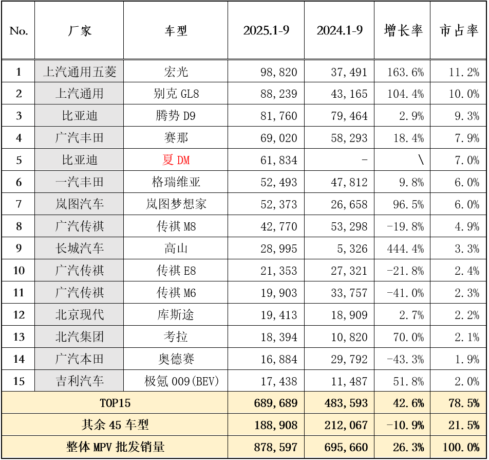TOP15简述。前三季度国内MPV TOP15车型累计批售69.0万辆,同比增长42.6%,高于整体MPV批发增速16.3个百分点,显示强者愈强的头部效益。TOP15市占率为78.5%,比2024年全年高出2.2个百分点,MPV市场集中度进一步提升,其余45个车型销量仅18.9万辆,仅占21.5%的市场份额(见表一)。